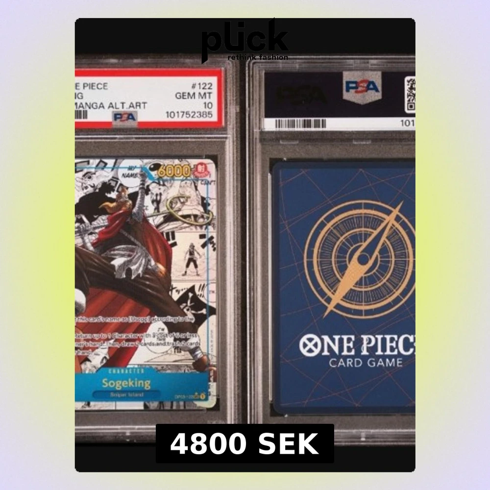 Säljer ett samlarkort från One Piece Card Game med Sogeking i Manga Alt Art-version. Kortet har färgstark design med svart, röd och gul färgskala och är innesluten i en PSA-skyddad plastkapsel. Perfekt för fans av anime och samlarkortspel.