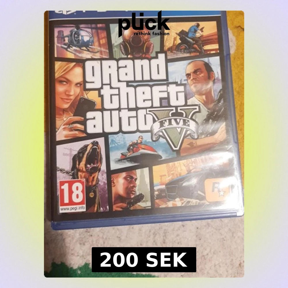 GTA V till PlayStation 4 med ikoniskt omslag. Spelet bjuder på action, äventyr och frihet i en öppen värld. Omslaget har färgstarka bilder, logotyp och PEGI 18-märkning. Perfekt för dig som gillar fartfyllda spel och spännande uppdrag.
