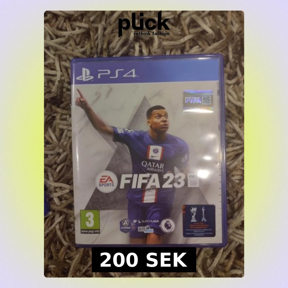 FIFA 23 till PlayStation 4 med blå plastfodral och original omslag. Spelet är ett fotbollsspel med realistisk grafik och många lag och spelare. Skivan är blå med vita tryck och innehåller även reklam för Ultimate Team. Perfekt för dig som gillar sportspel och gaming.