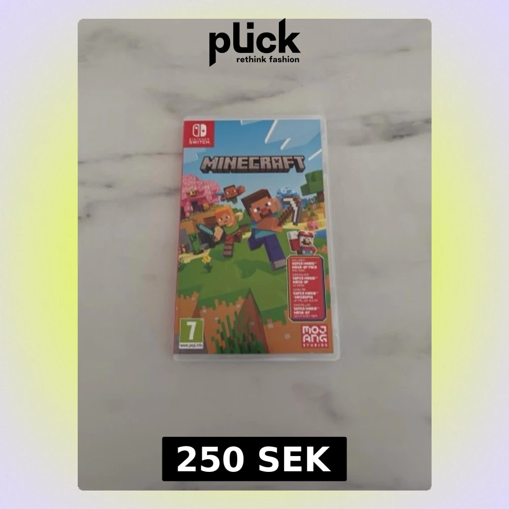 Minecraft till Nintendo Switch, komplett med fodral och spelkassett. Omslaget har färgglad grafik med karaktärer och blockig värld i grönt, blått och brunt. Perfekt för dig som gillar kreativt byggande och äventyr.