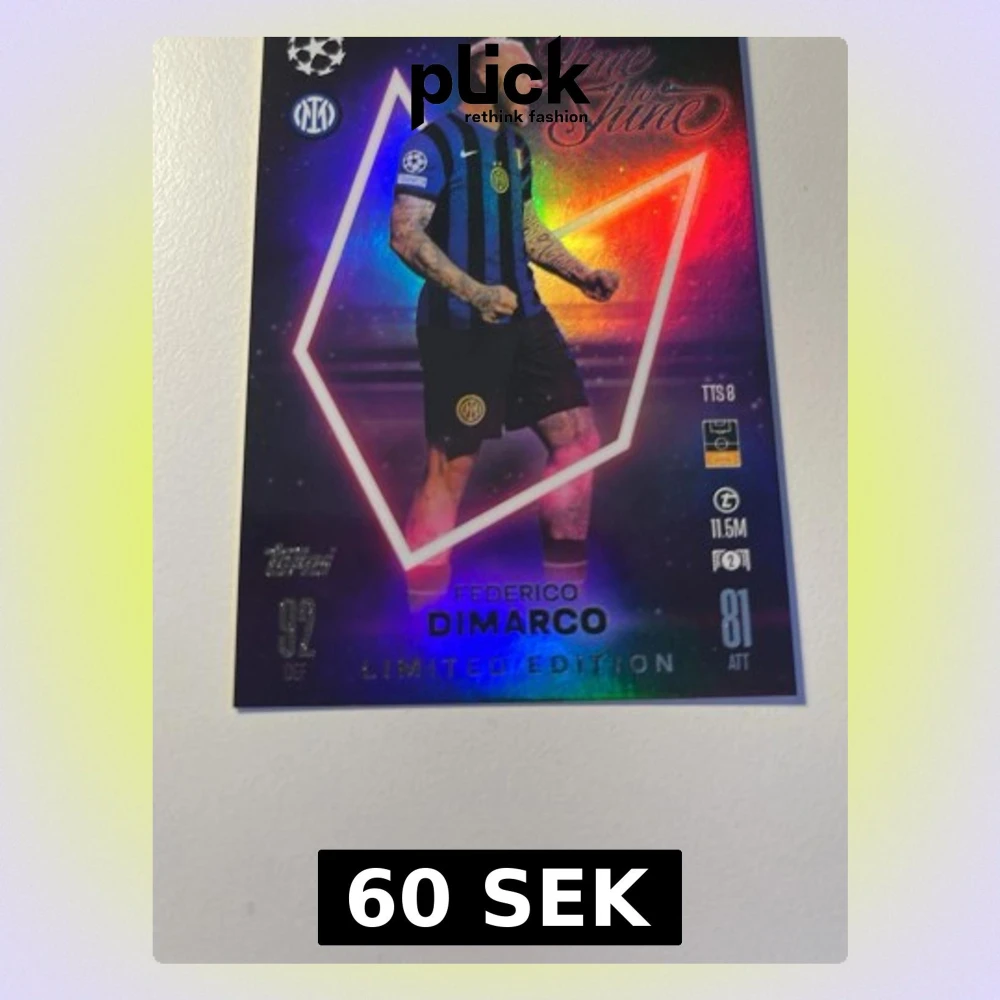 Säljer en Limited Edition fotbollssamlarbild från Topps med Federico Dimarco i Inter Milans blåsvarta matchställ. Kortet har holografisk regnbågseffekt och detaljer som klubbmärke, statistik och Champions League-logga. Perfekt för samlare av fotbollskort.