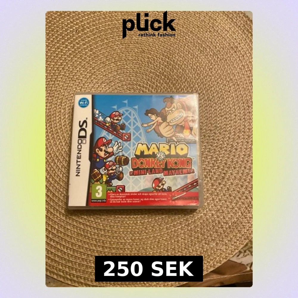 Nintendo DS-spelet Mario vs Donkey Kong: Mini-Land Mayhem med färgglad omslagsdesign. Plattformsspel där du styr Mini-Marios genom olika banor och löser pussel. Omslaget är blått, rött och gult med Mario och Donkey Kong i tecknad stil. Plastfodral.