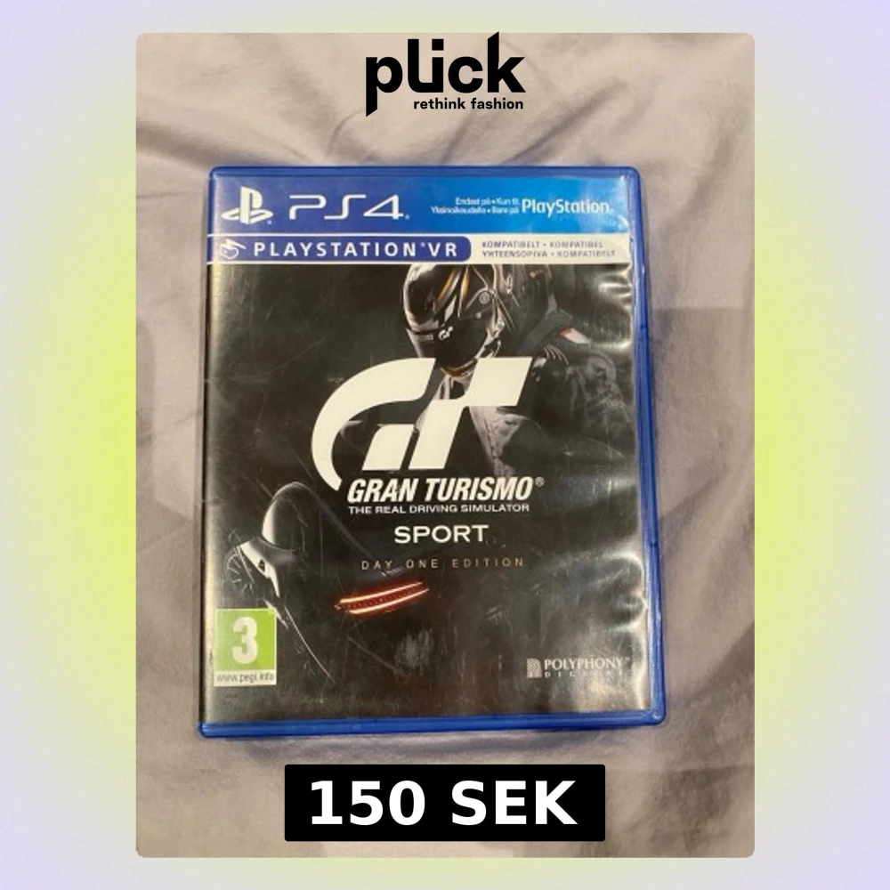Gran Turismo Sport Day One Edition till PS4, ett racingspel med realistisk körkänsla. Spelet kommer i ett blått plastfodral med originalskiva och manual. Omslaget har svart bakgrund med vita och gula detaljer samt en racingförare i hjälm. Funkar sjukt bra