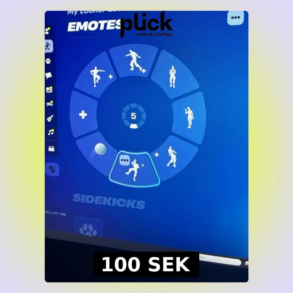 Säljer ett Fortnite-konto med flera unika skins, pickaxes och emotes. Perfekt för dig som vill ha en personlig locker med olika karaktärer och coola dansrörelser. Allt är digitalt och spelet har en blå bakgrund med tydliga menyer.