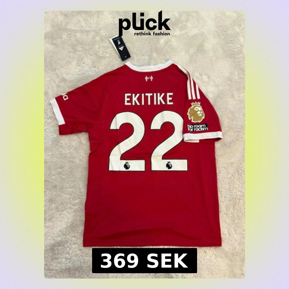 Säljer en röd Liverpool matchtröja från Adidas med Ekitike och nummer 22 på ryggen. Tröjan har vita detaljer, Premier League-märke och 'No room for racism' på ärmen. Klassisk design med klubbmärke och sponsortryck framtill.