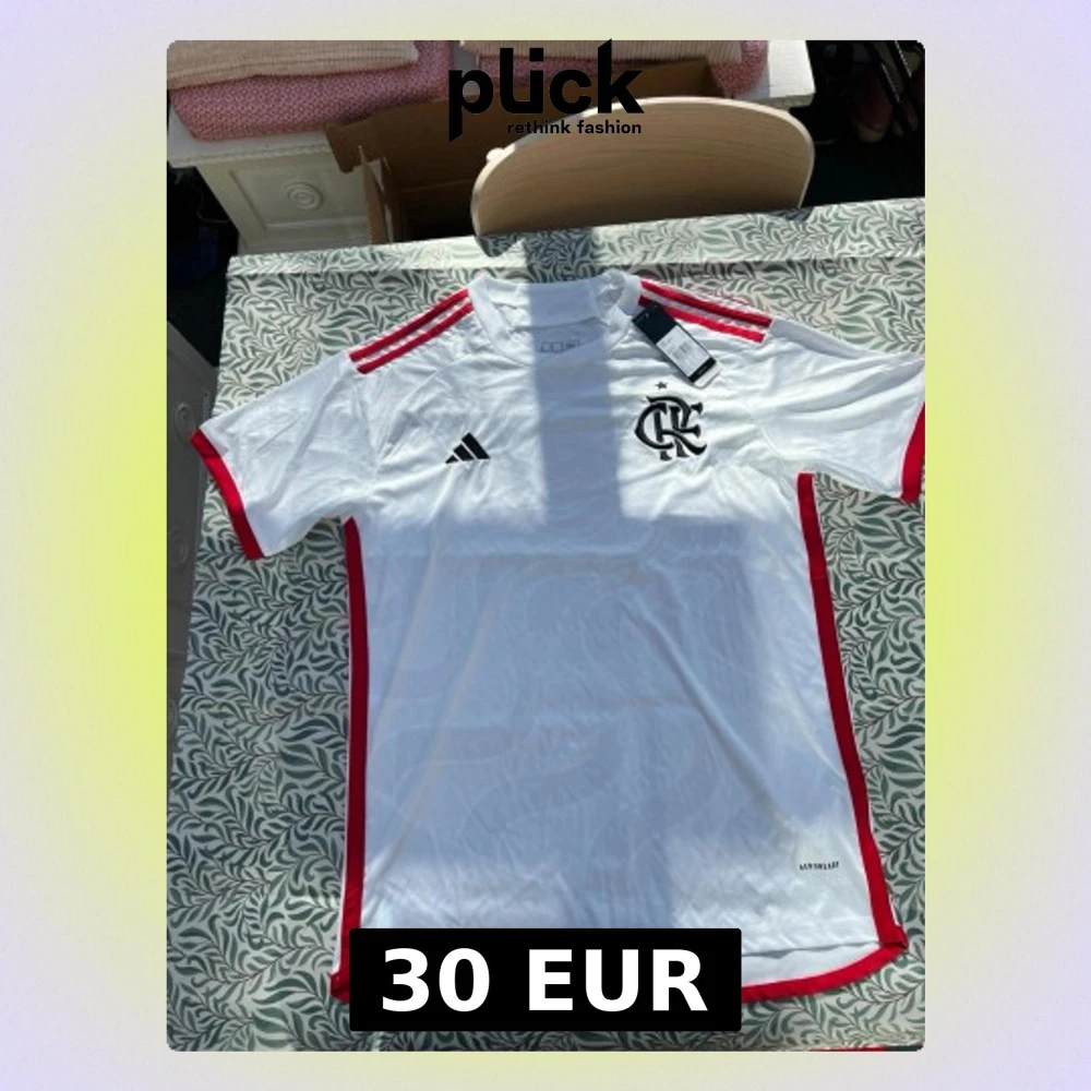 Snygg vit matchtröja från Adidas med Flamengo-logga på bröstet, röda detaljer längs sidor och axlar samt svarta Adidas-ränder. Tillverkad i lätt och ventilerande material med Aeroready-teknologi. Perfekt för fotboll eller träning.