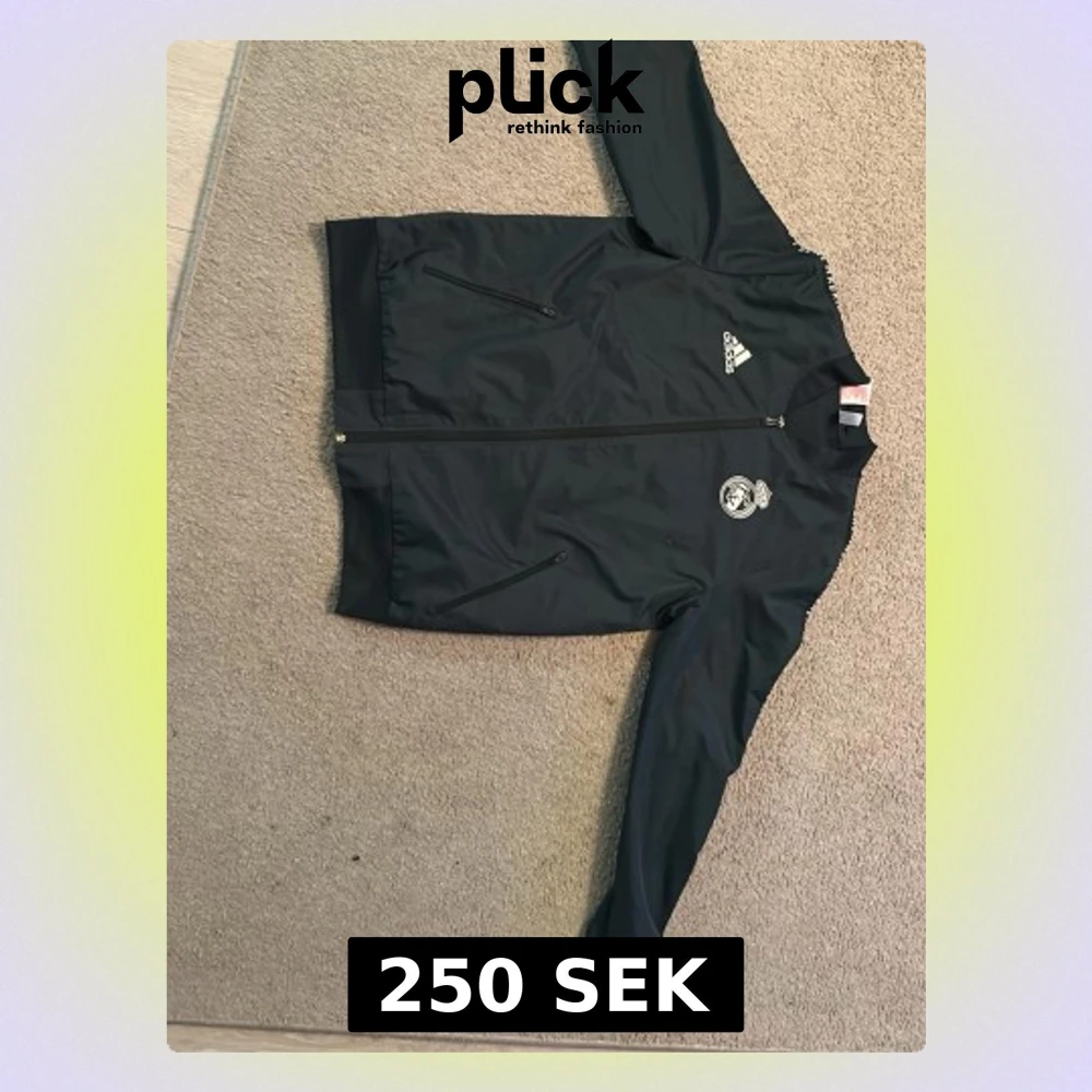 Snygg svart träningsjacka från Adidas med Real Madrid-logga på bröstet och vita Adidas-detaljer. Jackan har dragkedja framtill, två fickor med dragkedja och ribbade muddar vid ärmslut och nederkant. Perfekt för träning eller till vardags.