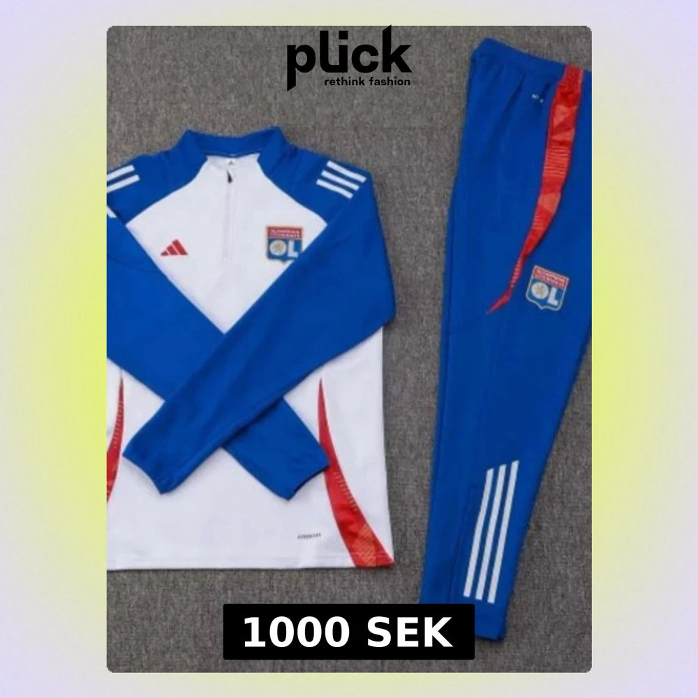 Snyggt träningsset från Adidas för Lyon med långärmad tröja och byxor. Tröjan är vit med blå ärmar, röda detaljer och klubbmärke på bröstet. Byxorna är blå med vita ränder och Lyon-logga. Perfekt för fotbollsträning eller gymmet.