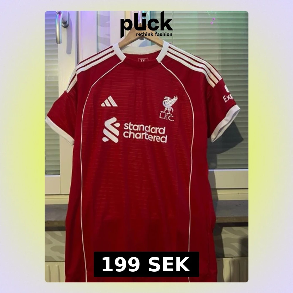 Säljer en röd Liverpool FC matchtröja från Adidas med vita detaljer och broderad LFC-logga på bröstet. Tröjan har vita ränder på axlarna, sponsortryck på framsidan och klassisk sportig passform. Perfekt för dig som älskar fotboll och vill stötta ditt lag.