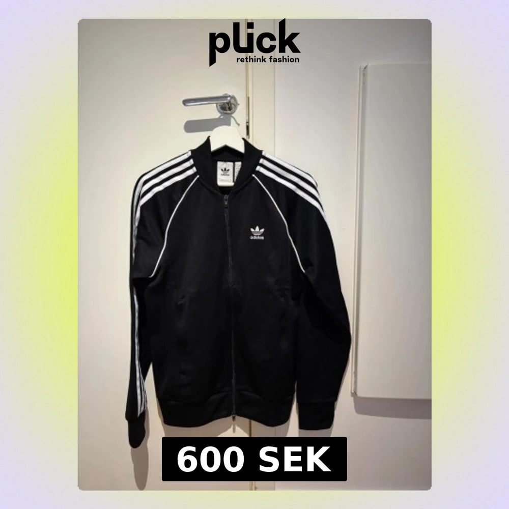 Klassisk svart Adidas track jacket med vita ränder längs ärmarna och vit logga på bröstet. Dragkedja framtill, ribbade muddar och krage. Tillverkad i ett glansigt syntetmaterial som ger en sportig look.