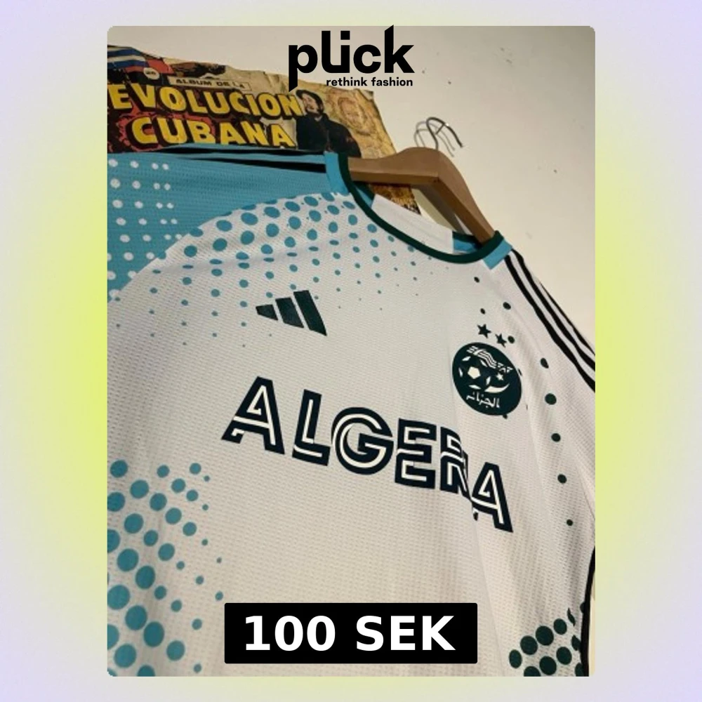 VIVA ALGERIA mon frere!, Snygg Algeriet matchtröja från Adidas i vitt med turkosa och svarta detaljer. Tröjan har trycket 'ALGERIA' på bröstet, landslagets emblem och tre svarta ränder på axlarna. Tillverkad i lätt och ventilerande funktionsmaterial, perfekt för fotboll eller träning.