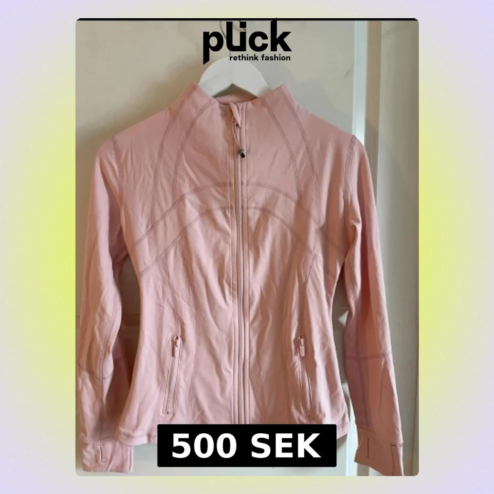 Snygg ljusrosa träningsjacka från Lululemon med figurnära passform, hel dragkedja framtill och två fickor med dragkedja. Jackan har långa ärmar och dekorativa sömmar för en sportig look. Perfekt för löpning eller gym.