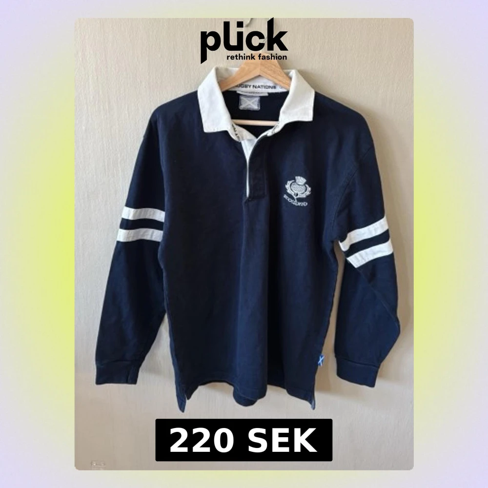 Klassisk mörkblå rugbytröja från Rugby Nations med vit krage och vita ränder på ärmarna. Broderad Skottland-logga på bröstet och lång ärm. Tillverkad i kraftig bomull, perfekt för sport eller chill.