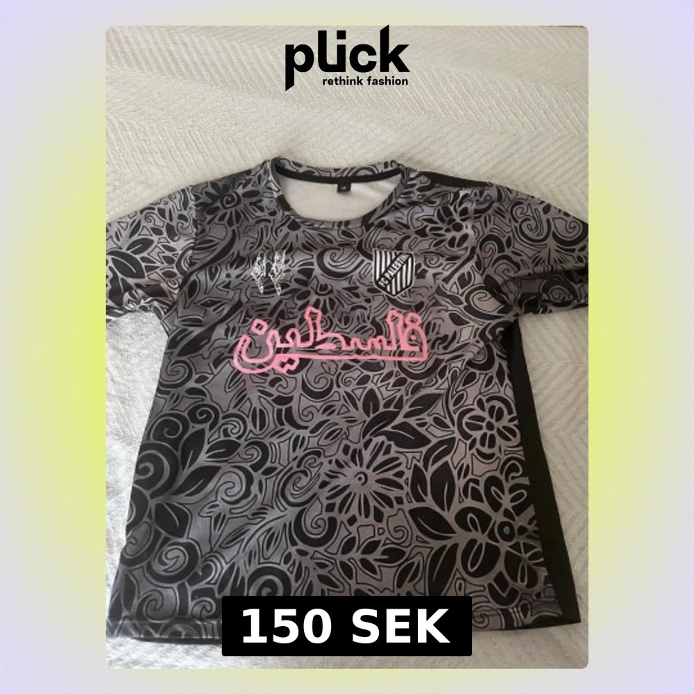 Unik sporttröja i svart och grått med blommigt mönster och rosa text på bröstet. Tröjan har rund hals, korta ärmar och klubbmärke på vänster sida. Tillverkad i ett lätt och snabbtorkande material, perfekt för träning eller match.