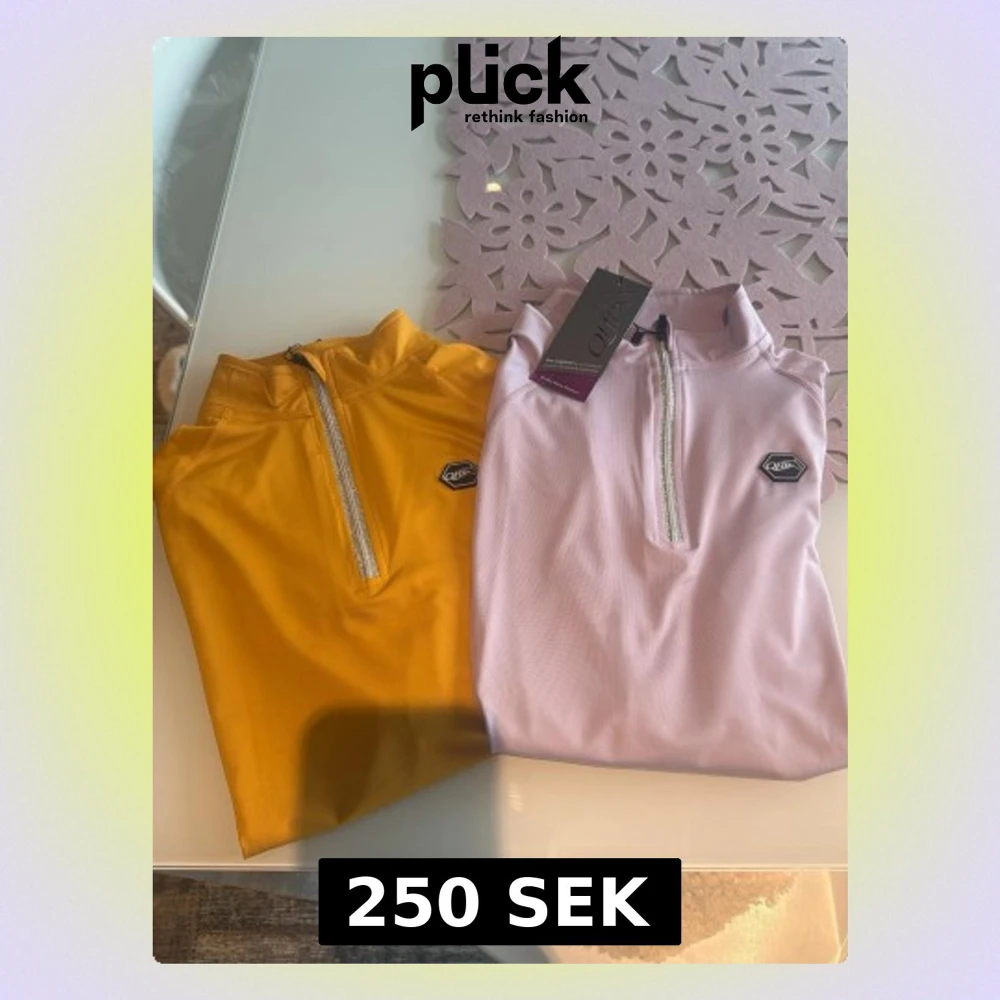 Två sportiga toppar från QHP, en i ljuslila och en i gul. Båda har hög krage och half zip-dragkedja framtill samt en liten logga på bröstet. Materialet känns stretchigt och funktionellt, perfekt för träning eller en aktiv dag.