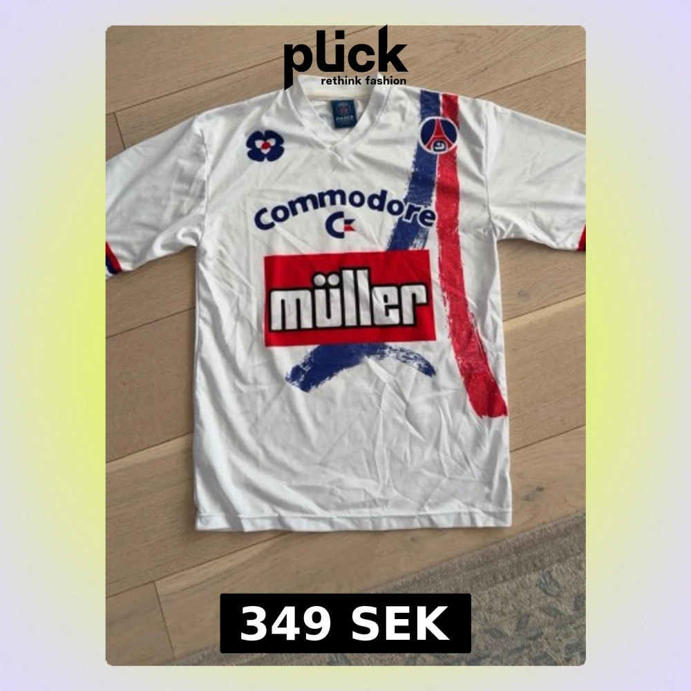 Säljer en retro vit PSG matchtröja med blå och röda detaljer, Commodore och Müller som sponsorer. Tröjan har klubbmärke på bröstet och tryck på både fram- och baksida. Tillverkad i lätt och ventilerande material, perfekt för fotboll eller samling.