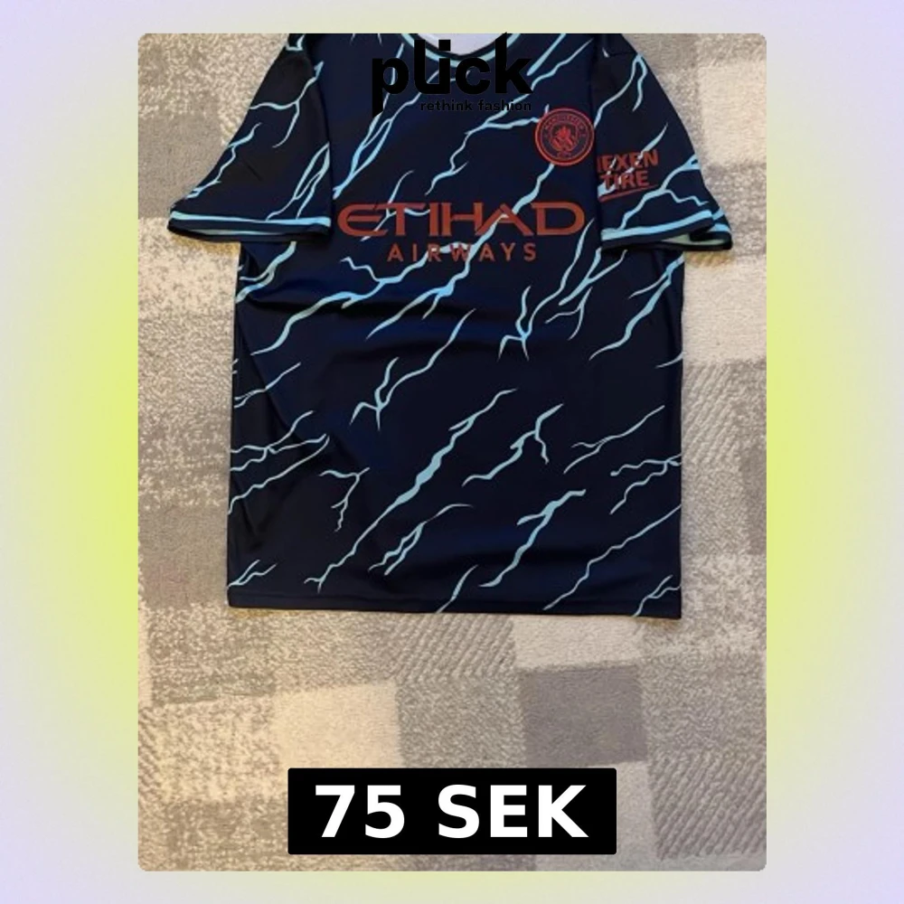 Säljer en blå Manchester City matchtröja med ljusblå blixtmönster och röda loggor. Tröjan har rund hals och är tillverkad i lätt, ventilerande polyester. Perfekt för fotboll eller träning, med Etihad Airways och Nexen Tire tryck på framsi