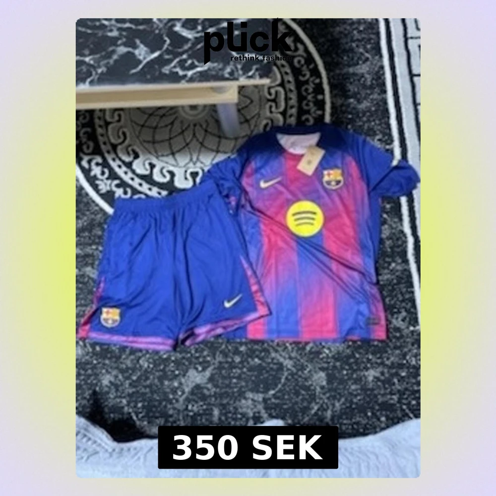 Säljer ett FC Barcelona matchställ från Nike med Dri-Fit material. Tröjan har blå och röda vertikala ränder, klubbmärke och sponsorlogga på bröstet samt Nike-logga. Tillhörande shorts i blått med klubbmärke och Nike-logga. Perfekt för fotbollsträning.