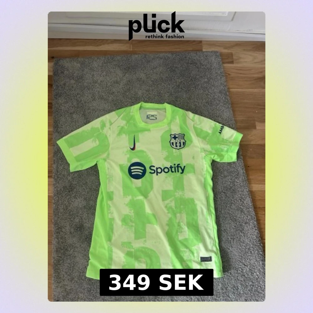 Säljer en neonljusgrön FC Barcelona matchtröja från Nike med tryck av Lamine Yamal och nummer 19 på ryggen. Tröjan har klubbmärke, Nike-logga och Spotify som sponsor framtill. Tillverkad i lätt och ventilerande material, perfekt för fotbollsträning eller match.