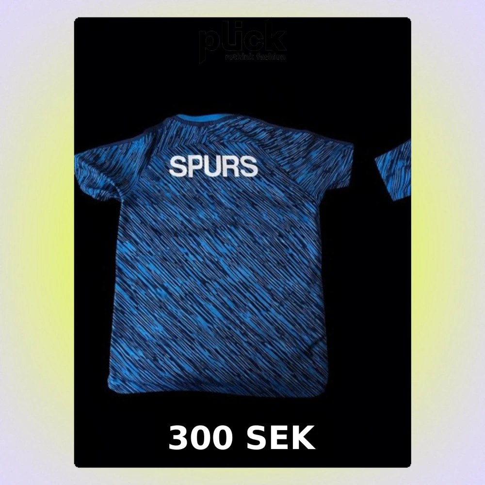 Säljer en blå träningströja från Nike med Tottenham Hotspur-logga och texten SPURS på ryggen. Tröjan har ett mönster i olika blå nyanser och är tillverkad i ett lätt, snabbtorkande material. Perfekt för fotbollsträning eller gymmet.