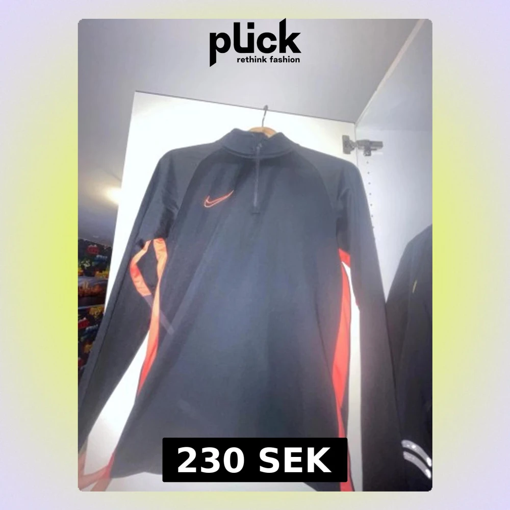 Snygg svart träningsjacka från Nike med röda detaljer längs sidorna och röd Nike-logga på bröstet. Jackan har halv dragkedja framtill och lång ärm, perfekt för löpning eller gym. Tillverkad i ett lätt och funktionellt material som andas.