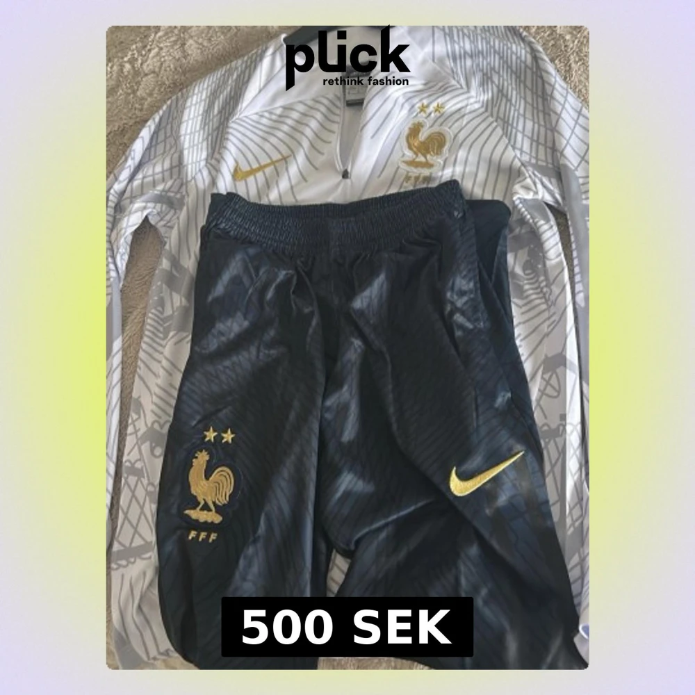 Säljer ett träningsset från Nike för Frankrikes landslag. Setet består av en vit långärmad zip-tröja med gråa detaljer och guldiga loggor samt svarta träningsbyxor med guldiga detaljer och elastisk midja. Både tröja och byxor har Frankrikes emblem och Nike swoosh.