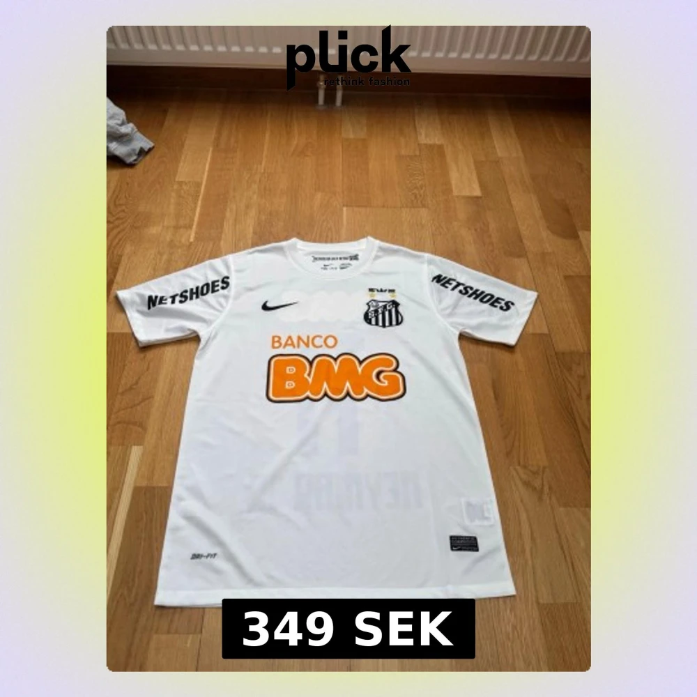 Säljer en vit Santos FC matchtröja från Nike med Dri-FIT material. Tröjan har tryckta sponsorer som BMG och Netshoes samt Santos klubbmärke på bröstet. Perfekt för fotbollsträning eller att bära som supporter. Klassisk rund hals och korta ärmar.