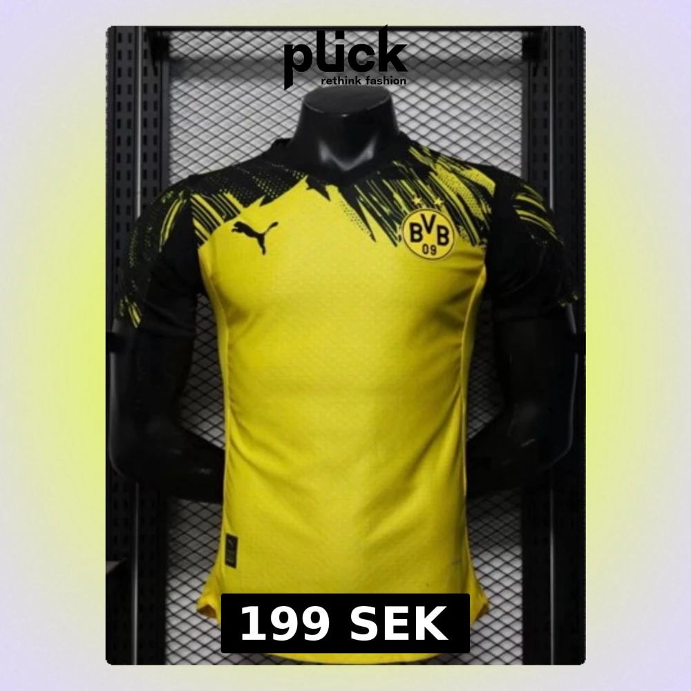 Snygg gul Borussia Dortmund matchtröja från Puma med svart grafiskt mönster över axlar och ärmar. Tröjan har klubbmärke och Puma-logga på bröstet. Tillverkad i lätt och ventilerande material, perfekt för träning eller match.