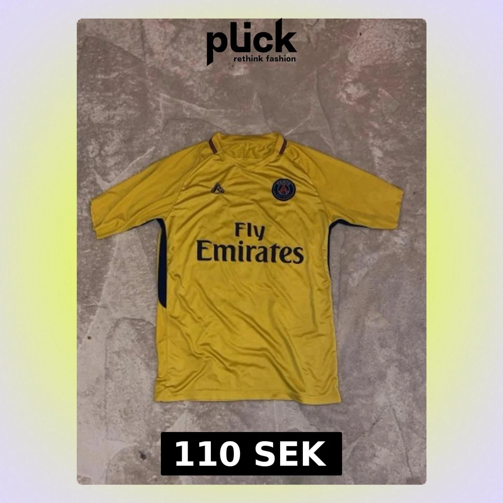 Gul PSG matchtröja med Neymar Jr och nummer 10 på ryggen. Tröjan har Fly Emirates-tryck på framsidan, klubbmärke på bröstet och mörkblå detaljer längs sidorna. Perfekt för fotbollsfans som vill sticka ut på planen.