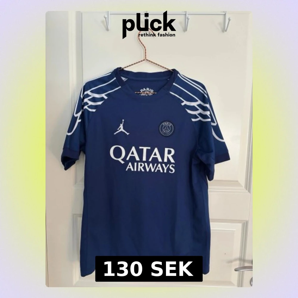 Säljer en blå PSG matchtröja från Jordan med vita detaljer och Qatar Airways-logga på bröstet. Tröjan har korta ärmar och coolt vingmönster på axlarna. Perfekt för fotbollsfans som vill representera sitt lag.
