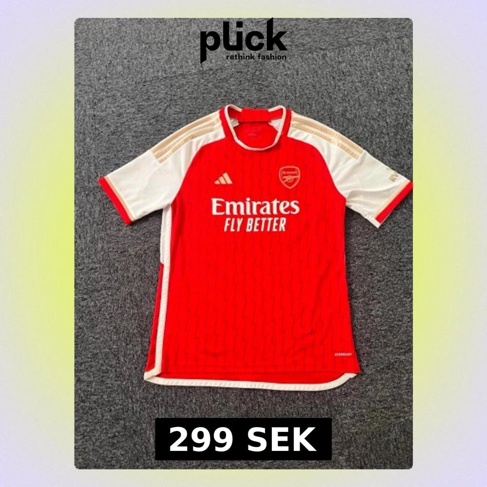 Säljer en röd Arsenal matchtröja från Adidas med vita och guldiga detaljer. Tröjan har blixtmönster på framsidan, klubbmärke och Adidas-logga i guld samt vita ärmar med guldiga ränder. Materialet är lätt och andas, perfekt för fotboll eller att bära till vardags.