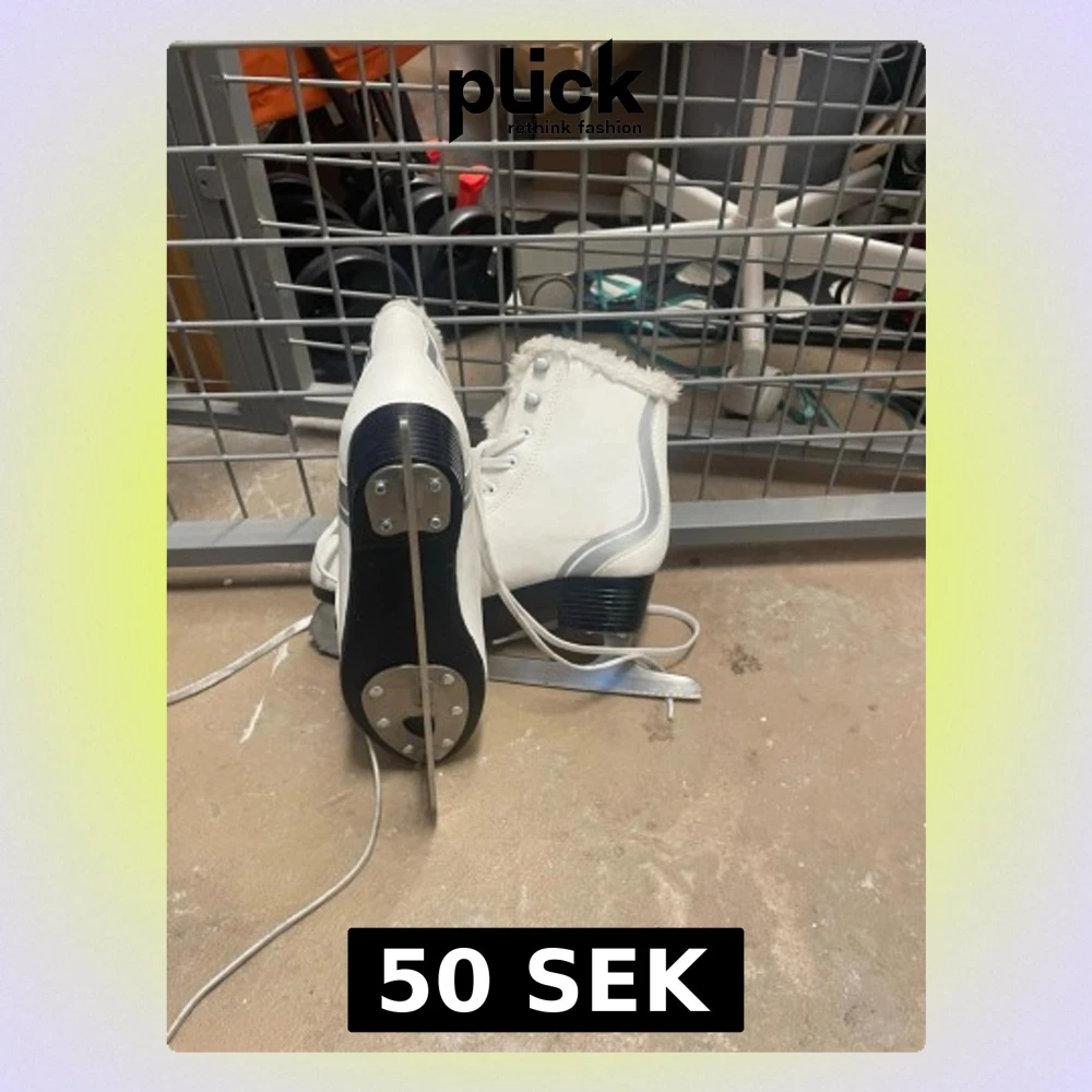 Säljer ett par vita skridskor från Spin med fluffig päls runt skaftet och silvriga detaljer på sidan. Skorna har snörning och en robust klack, samt en platt sula med fastmonterad stålskena. Perfekt för dig som vill glida fram på isen med stil.