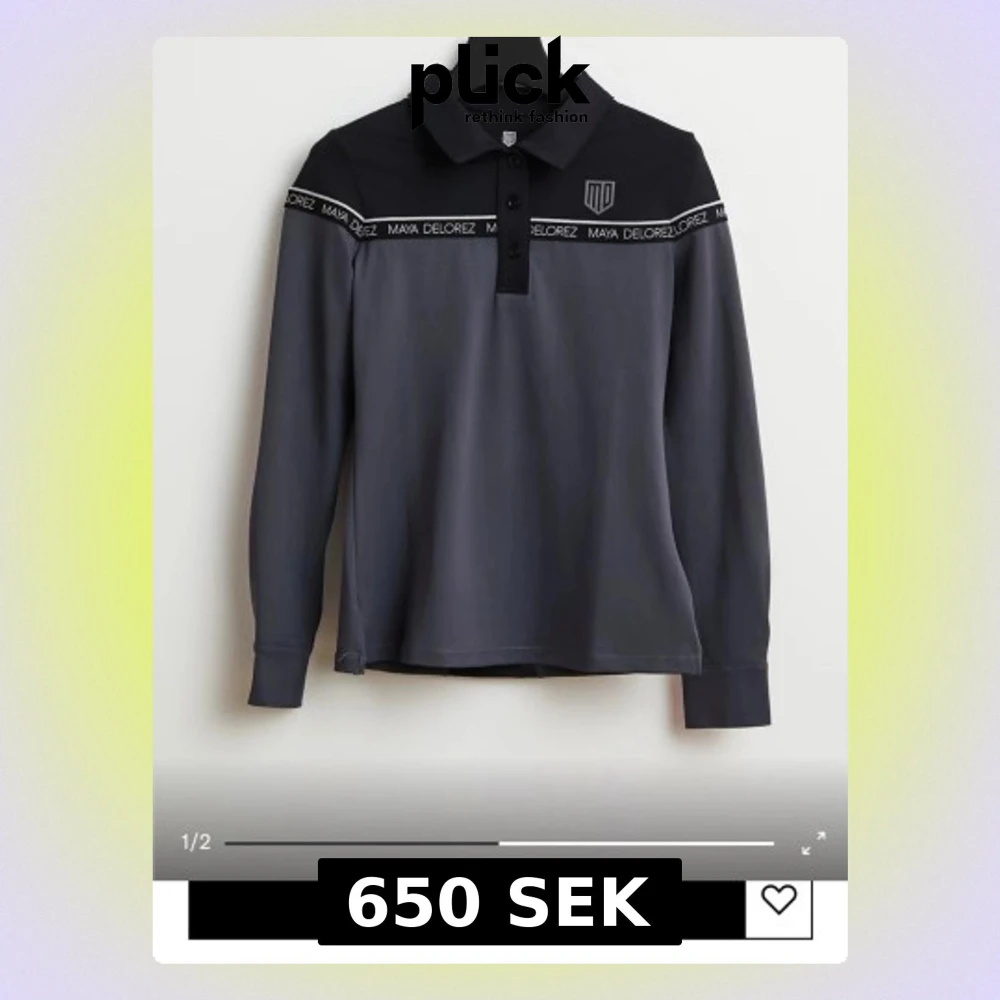 Snygg långärmad tröja från Maya Delorez i mörkgrått med svart axelparti och krage. Tröjan har tryckt logoband över bröstet och knappar vid halsen. Perfekt för dig som gillar sportig och stilren design.