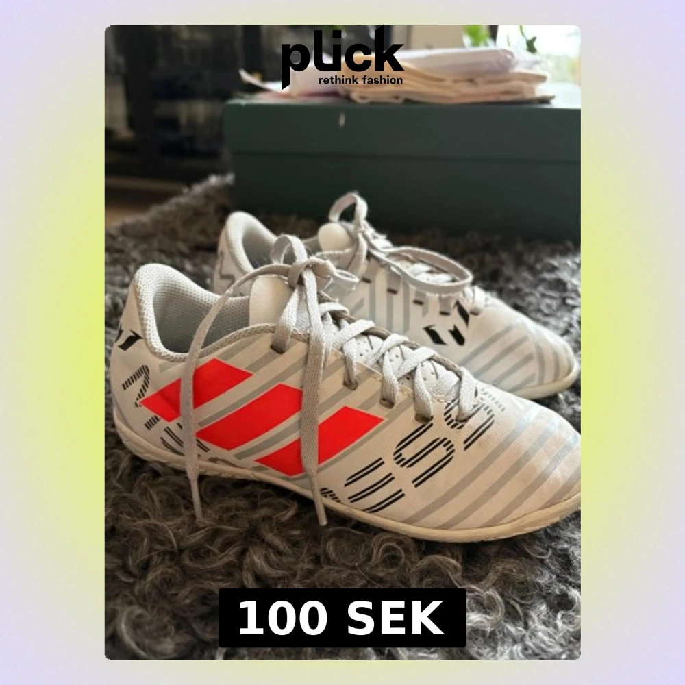 Säljer ett par Adidas inneskor i vitt med neon orange, ljus gråa och svart detaljer. Skorna har snörning och ett randigt mönster över hela ovandelen. Materialet är syntet med mesh vid öppningen för extra ventilation. Snygg, sportig design med platt sula och rund tå.
