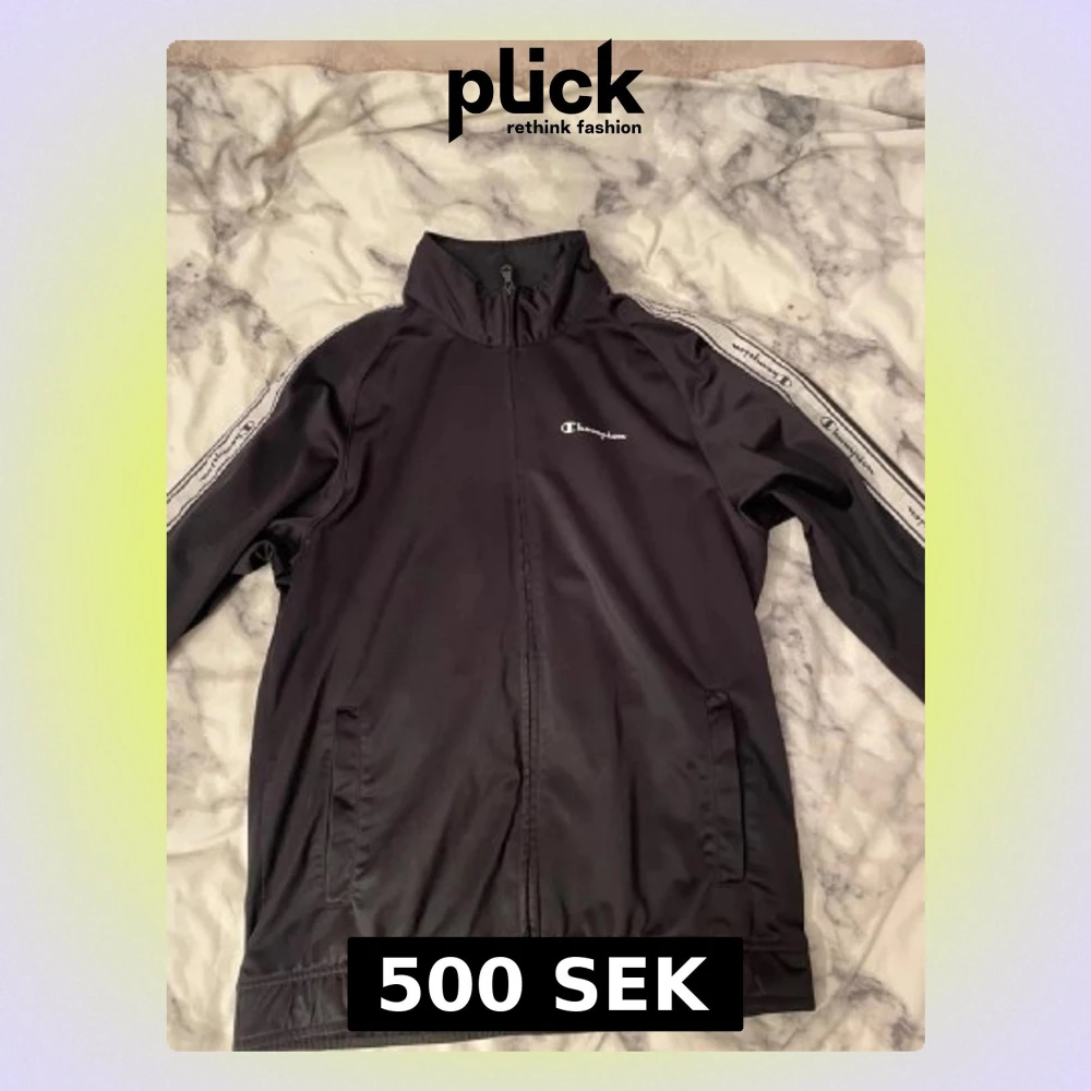 Bilderna visar ett svart Champion tracksuit-set med jacka och byxor, men inga skor finns med.