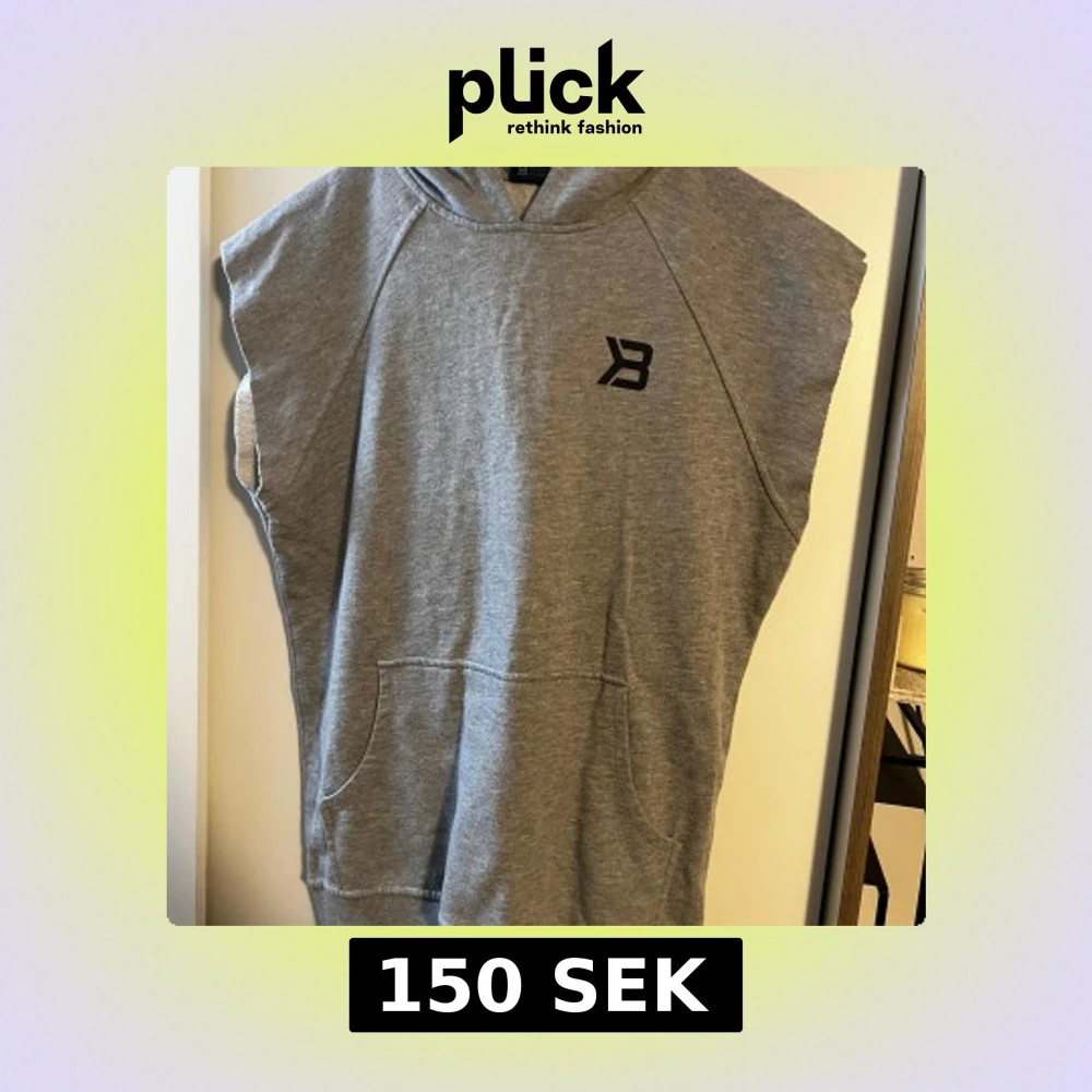 Säljer en grå ärmlös hoodie från Better Bodies i storlek S. Tröjan har huva, magficka och tryckt logga både fram och bak. Perfekt för gymmet eller chill dagar. Materialet är mjuk bomull med ribbad nederkant och råa kanter vid ärmarna för en sportig vibe.