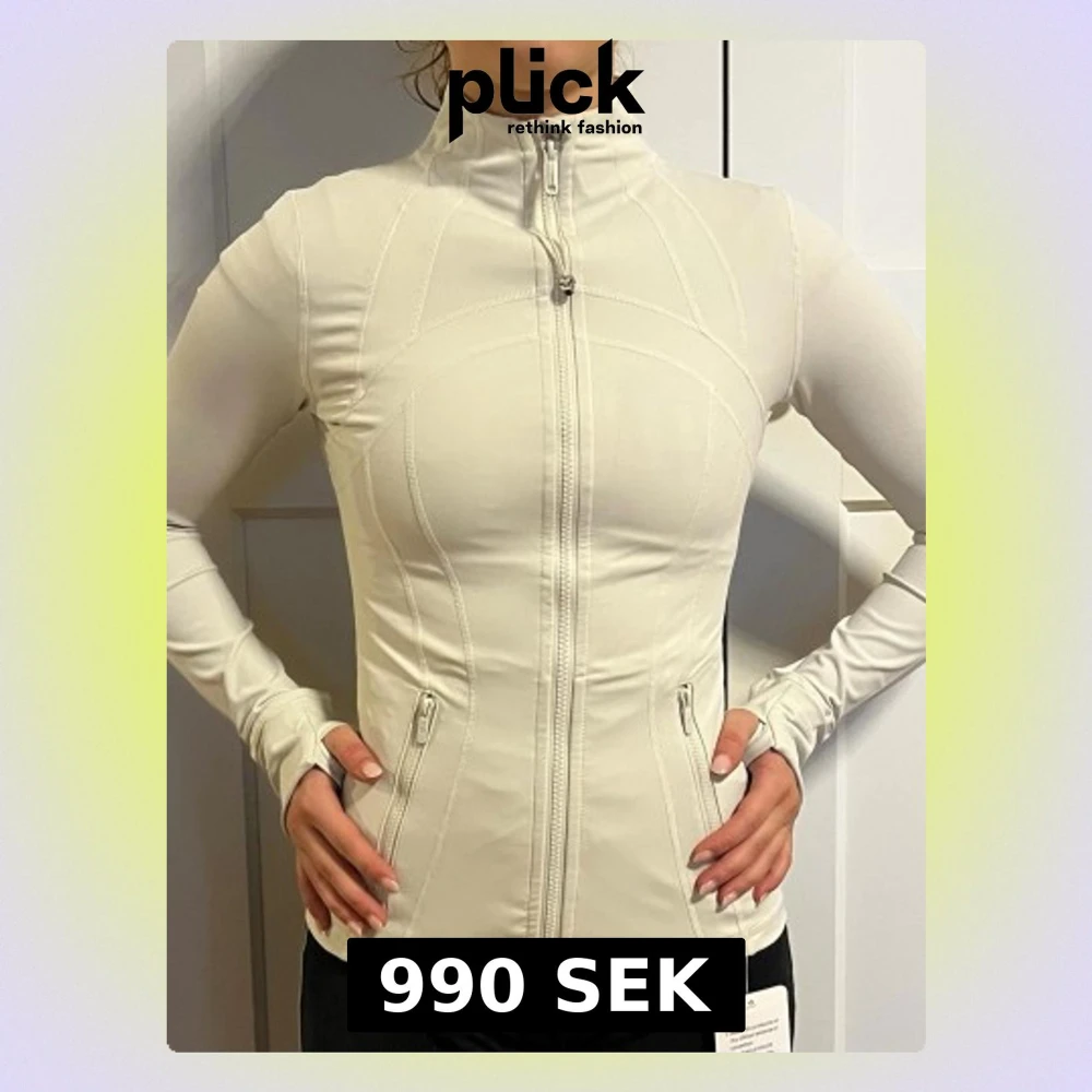 Slimmad vit träningsjacka från Lululemon med hög krage, tumhål och hel dragkedja framtill. Två dragkedjefickor på sidorna och snygga sömdetaljer. Tillverkad i stretchigt funktionsmaterial som passar perfekt till träning eller som lager.