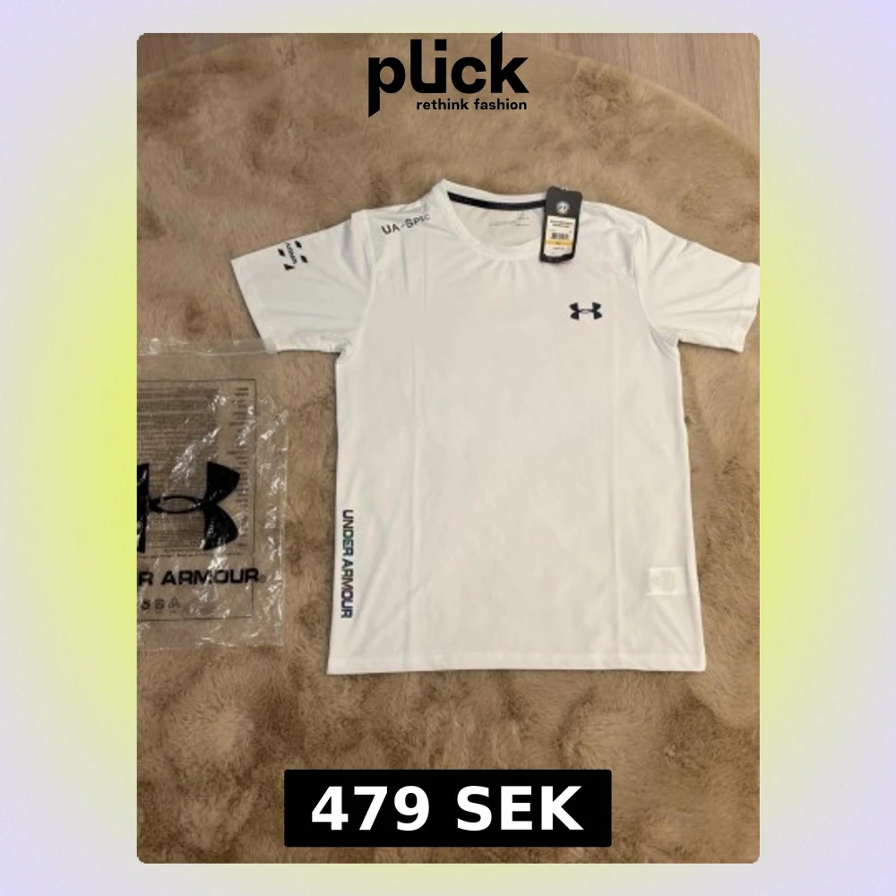 Vitt t-shirt från Under Armour med korta ärmar och rund hals. Materialet är mjukt och stretchigt polyester, perfekt för träning. Diskret logga på bröstet och färgglad Under Armour-text längs sidan. Snygg och sportig look för dig som gillar att hålla igång. Kom dm för eventuella frågor 🧐 pris kan diskuteras 💯 T-shirt kommer med sin förpackning 🤩har aldrig används är i nytt skick.
