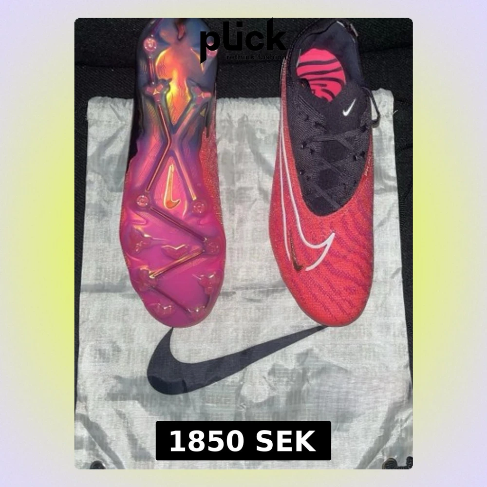 Säljer ett par Nike Phantom GT2 Elite fotbollsskor i röd och svart med vit swoosh. Skorna har snörning, mönstrad ovandel och en cool iriserande sula med dobbar för gräsplan. Ovandelen är i syntetmaterial och innersulan har ett zebramönster i rosa och svart.