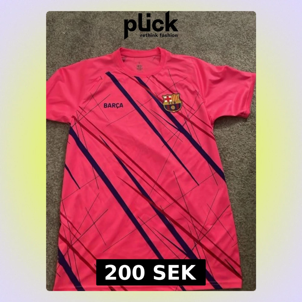 Säljer en riktigt snygg rosa FC Barcelona matchtröja i storlek S. Tröjan har ett grafiskt mönster i mörkblått och rött, samt klubbens emblem på bröstet. Perfekt för dig som älskar Barça och vill sticka ut på planen eller läktaren.