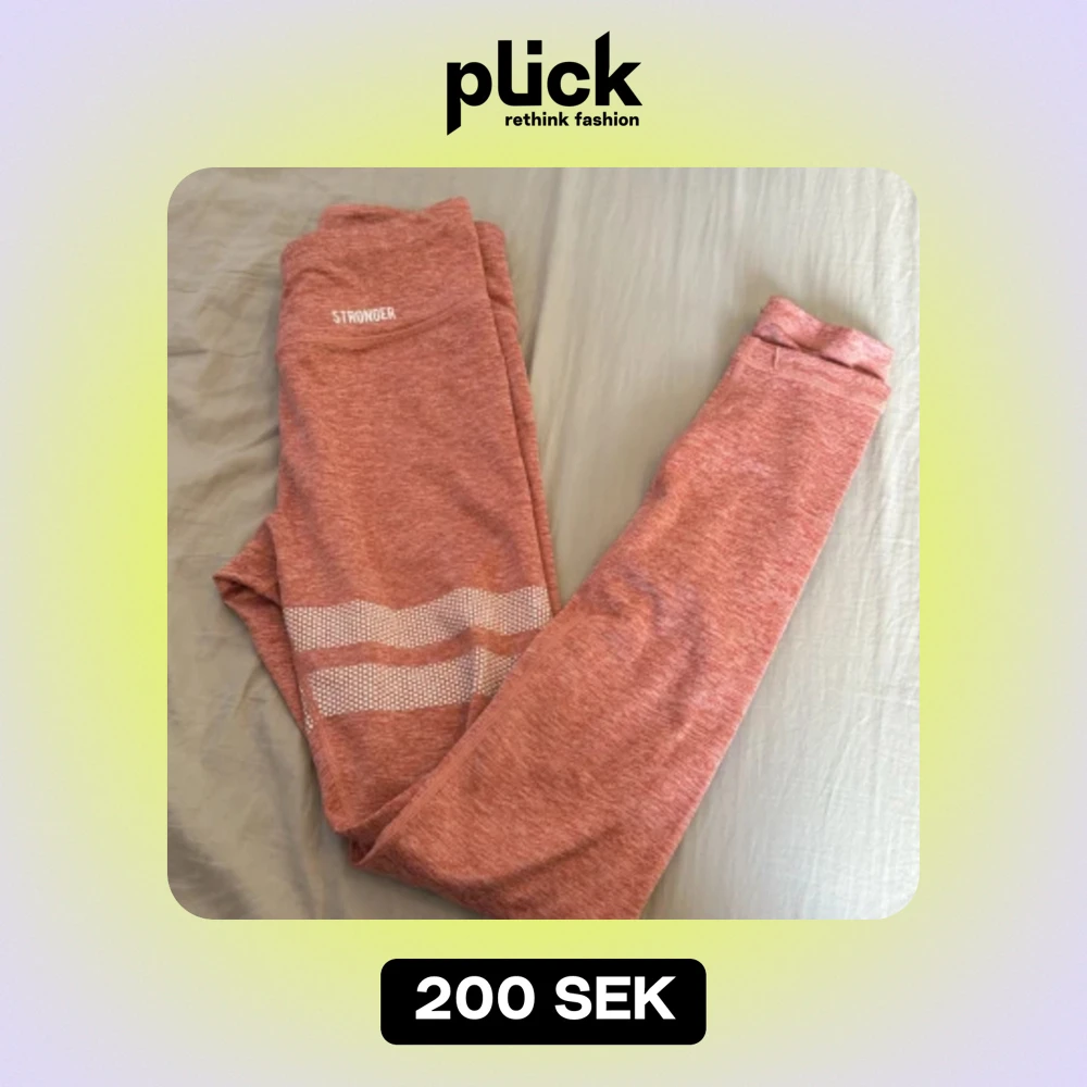 Säljer ett par snygga rosa leggings från Stronger. De är högmidjade och perfekta för träning. Materialet är mjukt och stretchigt, vilket gör dem superbekväma. De har ett coolt mönster med vita prickar och ränder runt benen. Perfekta för gymmet eller en löprunda!