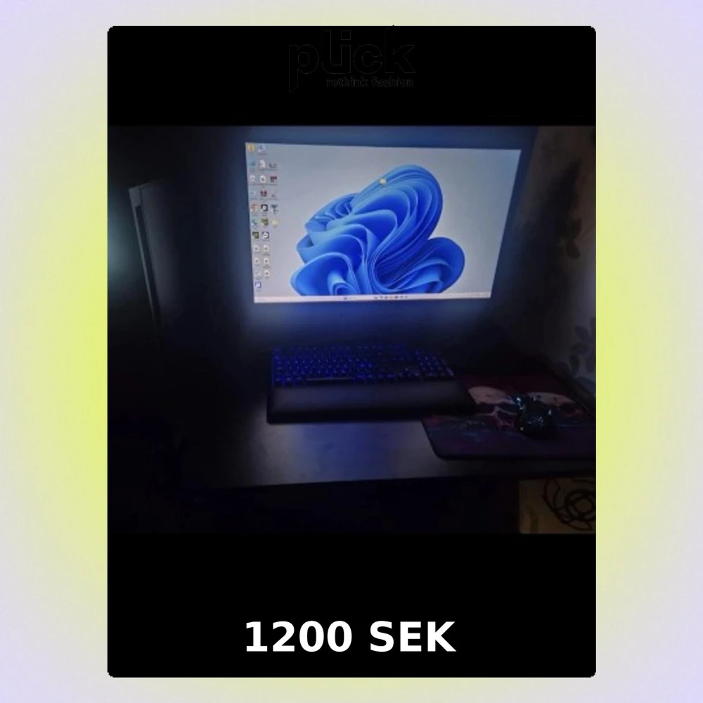 Säljer en stationär Windows-dator med svart chassi och sidopanel i glas. Utrustad med RGB-belysning på insidan, mekaniskt tangentbord med blå bakgrundsbelysning och stor skärm. Perfekt för gaming och kreativa projekt.
