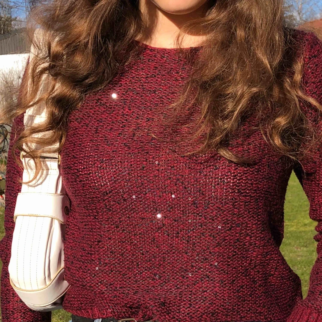 Glittrig röd stickad tröja😻✨🌟 Det som glittrar på första bilden är från paljetter i tröjan☺️ Endast använd en gång.