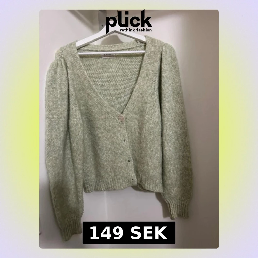 Mysig ljusgrön stickad kofta från ONLY med v-ringning och knappar framtill. Koftan har långärmade puffärmar och ribbade muddar vid ärmslut och nederkant. Ursäkta dålig belysning.
