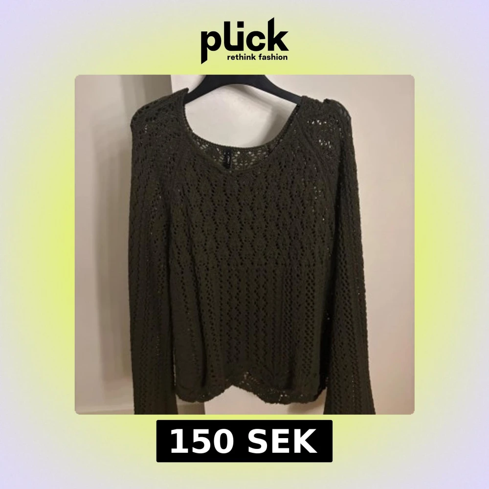 Säljer en mörkgrön stickad tröja från Only med snyggt hålmönster och rund halsringning. Använd fåtal gånger