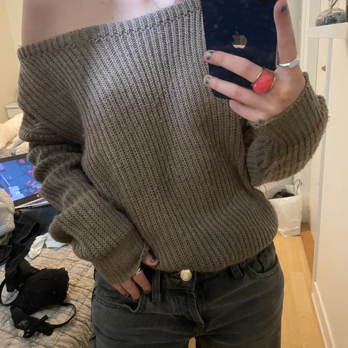 Super fin stickad tröja som är lite off shoulder i en fin brun färg. Köpt second hand så märket är lite oklart