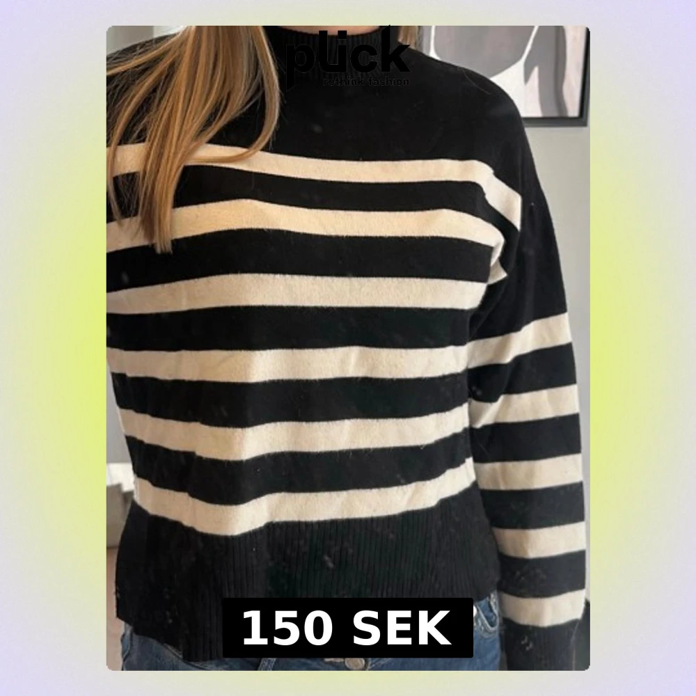 Säljer en svart stickad tröja med vita ränder ifrån ONLY. Tröjan har hög hals, långa ärmar och ribbstickade muddar. Tröjan har blivit lite nopprig men inget som syns. Pris kan diskuteras.