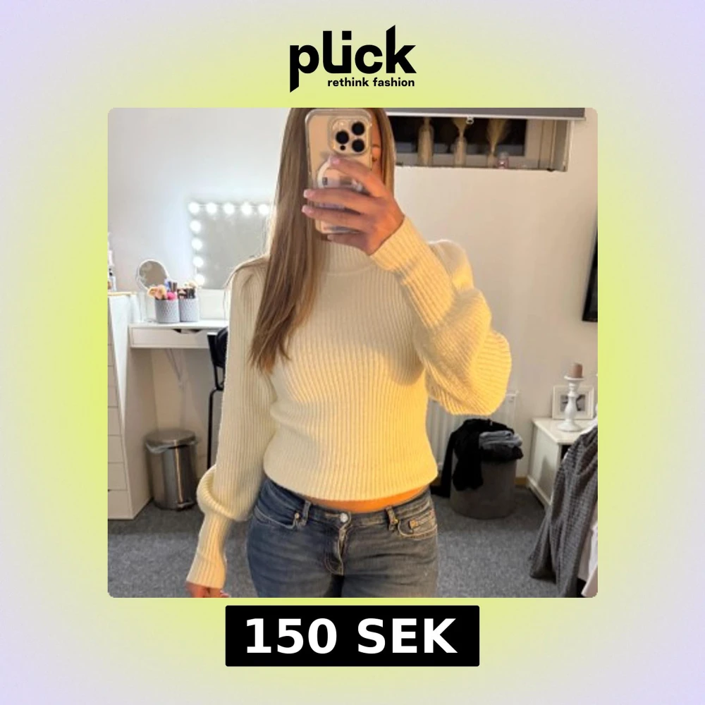 Säljer en ribbad stickad tröja i ljusbeige med croppad passform och långärmade puffärmar. Tröjan har en hög hals och är perfekt för att ge en chill och snygg vibe till din outfit. Supermjuk och skön att bära under kyliga dagar.