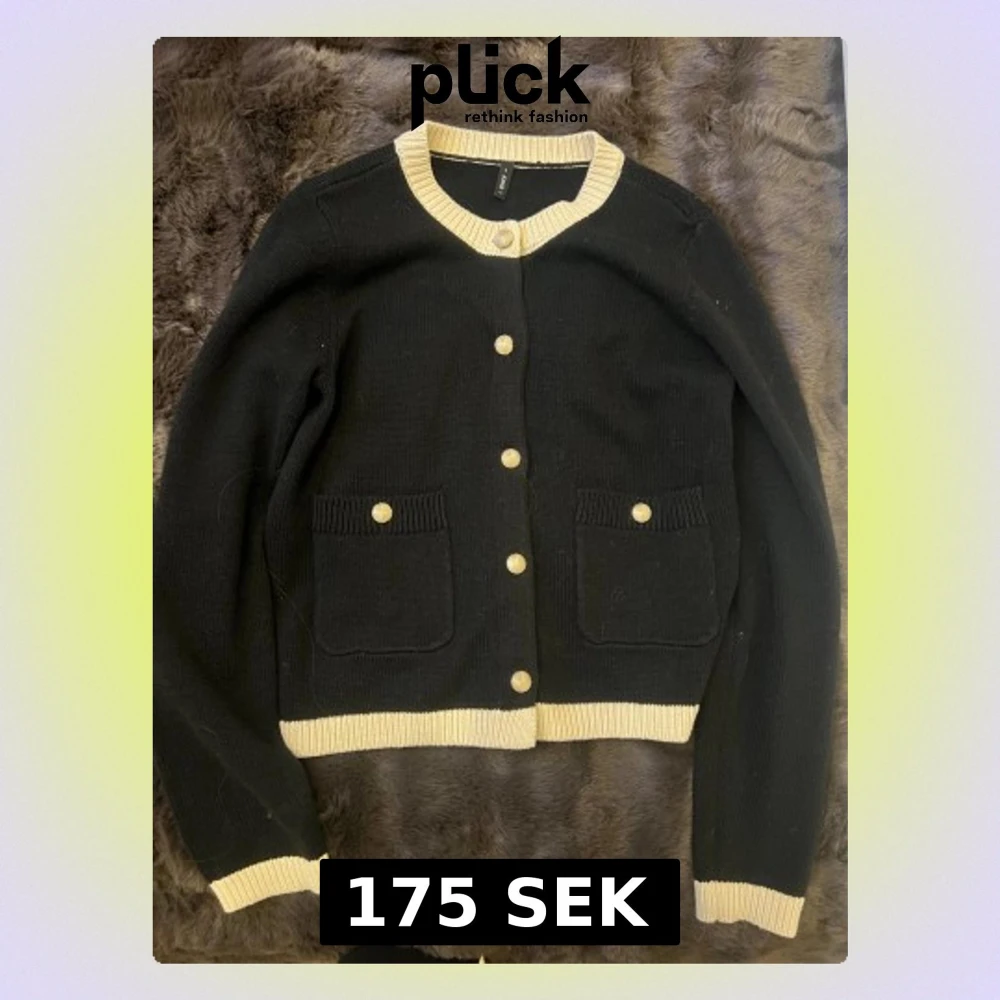Svart fin stickad cardigan med ljus beige rand längst halsen, armarna och längst ner på tröjan, tröjan har guldknappar med ett fint mönster på, tröjan är andvänt ett fåtal gånger