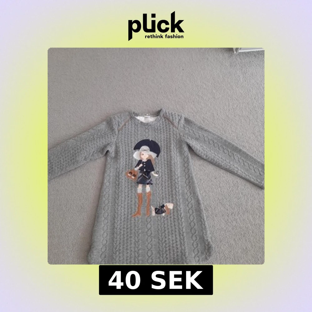Säljer en grå stickad klänning med lång ärm och ett broderat motiv av en tjej med hund framtill. Klänningen har ett kabelstickat mönster och är perfekt för dig som gillar unika detaljer.